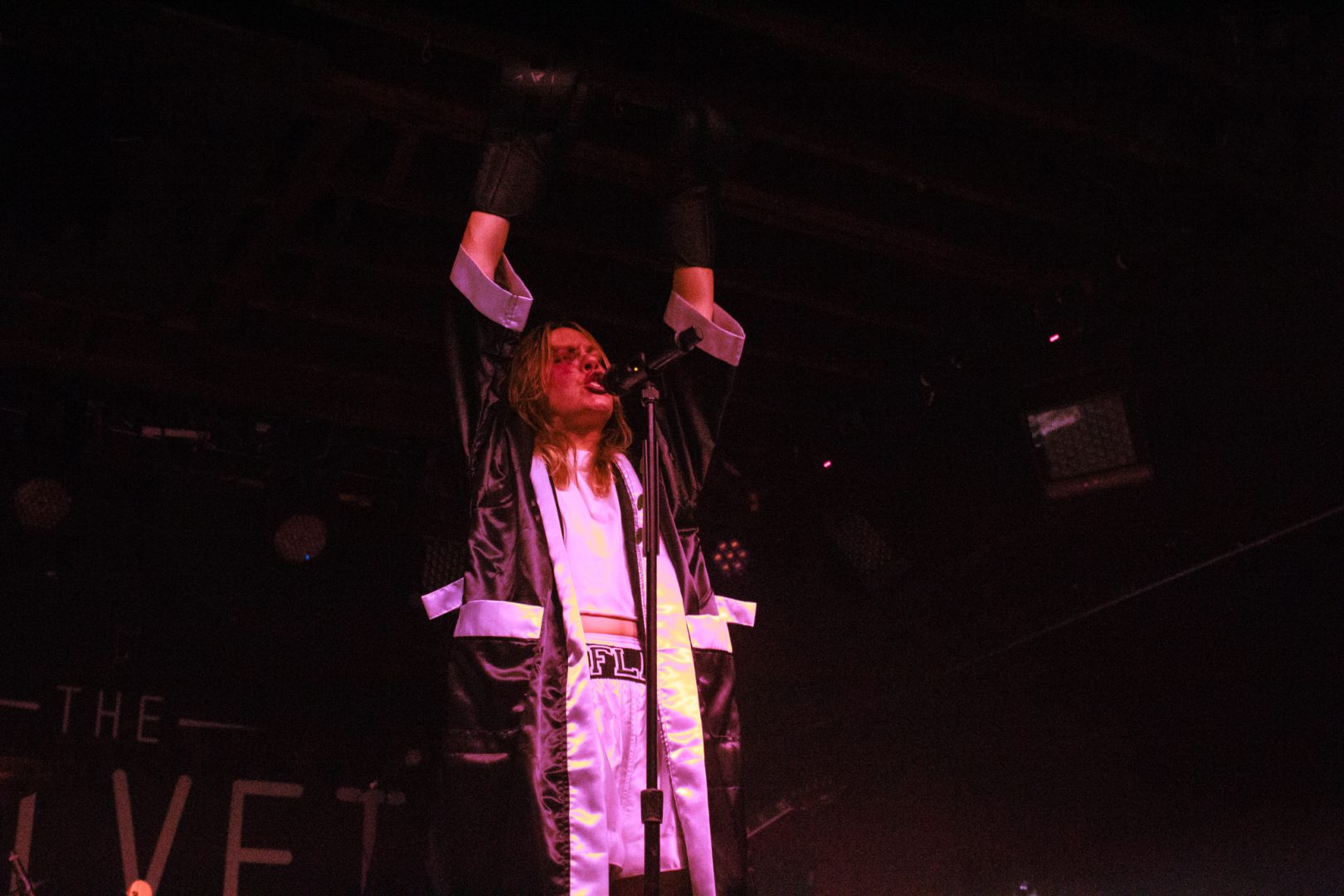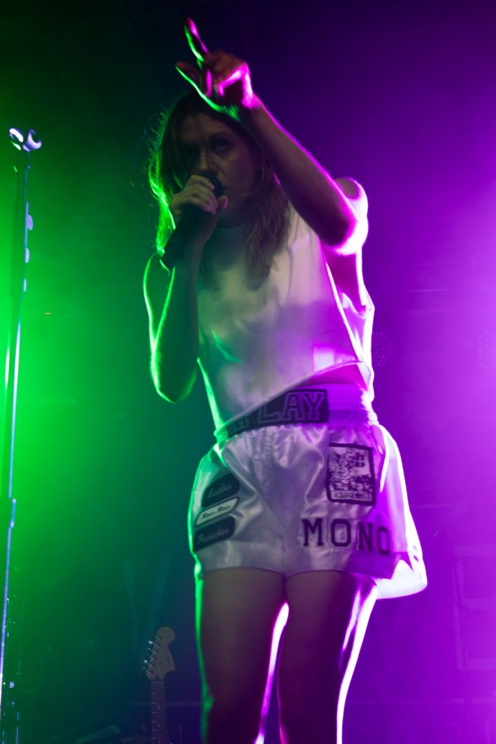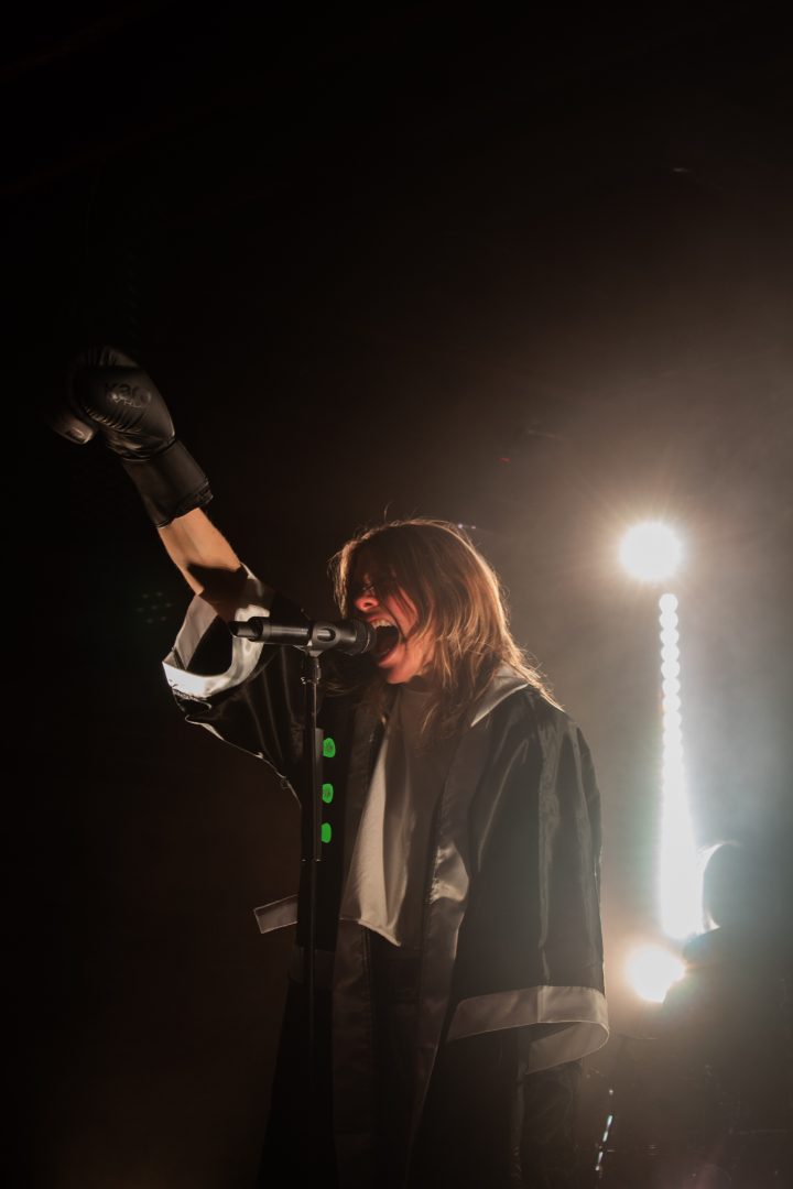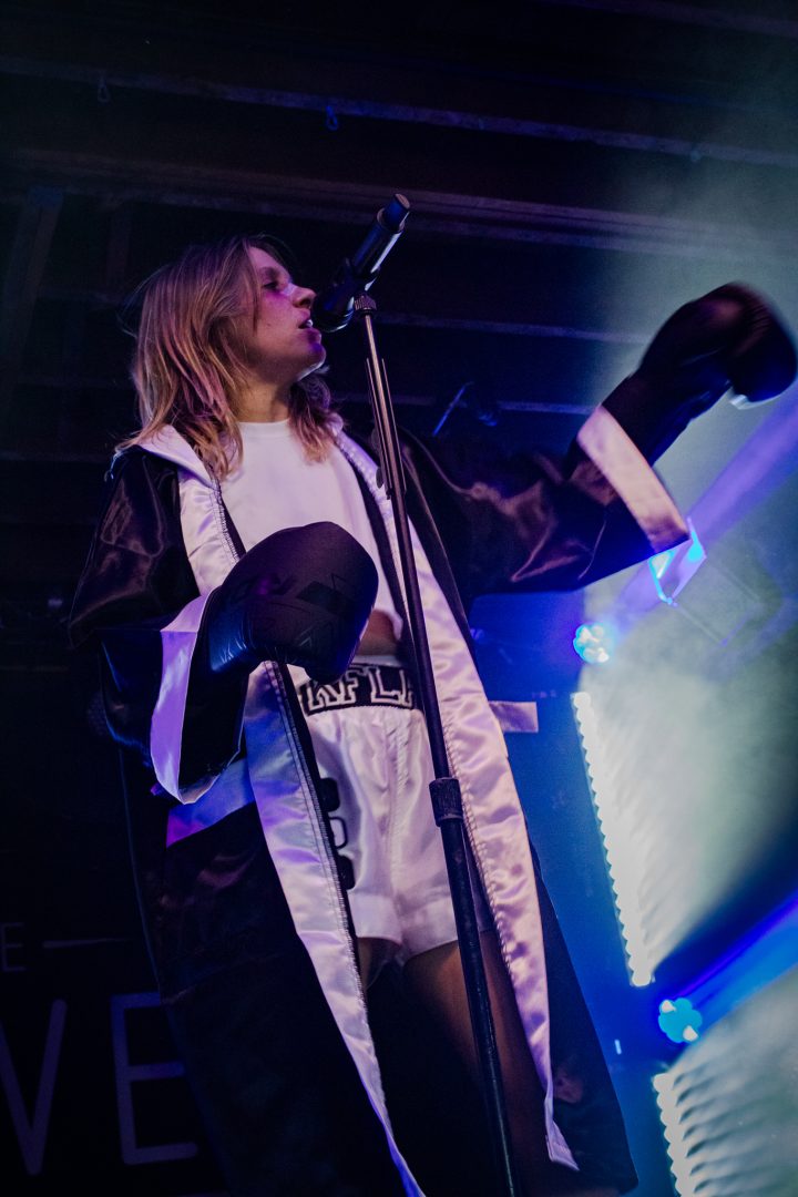 A voice of an announcer rings over the PA system calling the fight of “K.Flay vs K.F.lay” as she enters the ring (the stage) for the ‘Mono Live in Stereo Tour‘ in support of her new album titled ‘MONO’. Showing off her boxing skills equip with boxing gloves, an official fighter robe and custom shorts with her name printed on the waste band all as her song “Are You Serious?” begins to play over the sound system at the Velvet Underground. The singer also cleverly wore a butterfly style bandage across the bridge of her nose to complete the look. K.Flay delivers a beautiful marriage of the alternative, rock and hip-hop genres which then creates high energy performances that fans are dancing around and headbanging to. The theatrics of coming out as a boxer to show the fight within oneself not only shows strength in creativity but it also adds relatability with the listener – we all have an internal 1 v 1 fight with ourselves at one time or another.