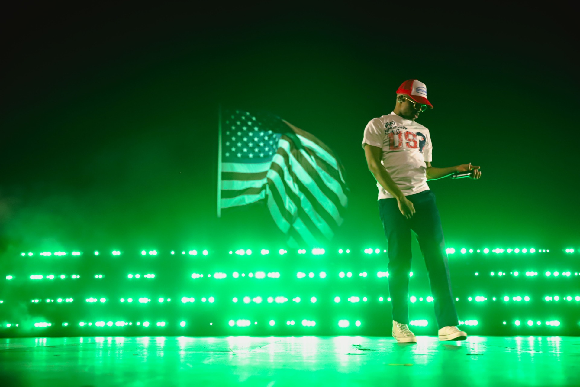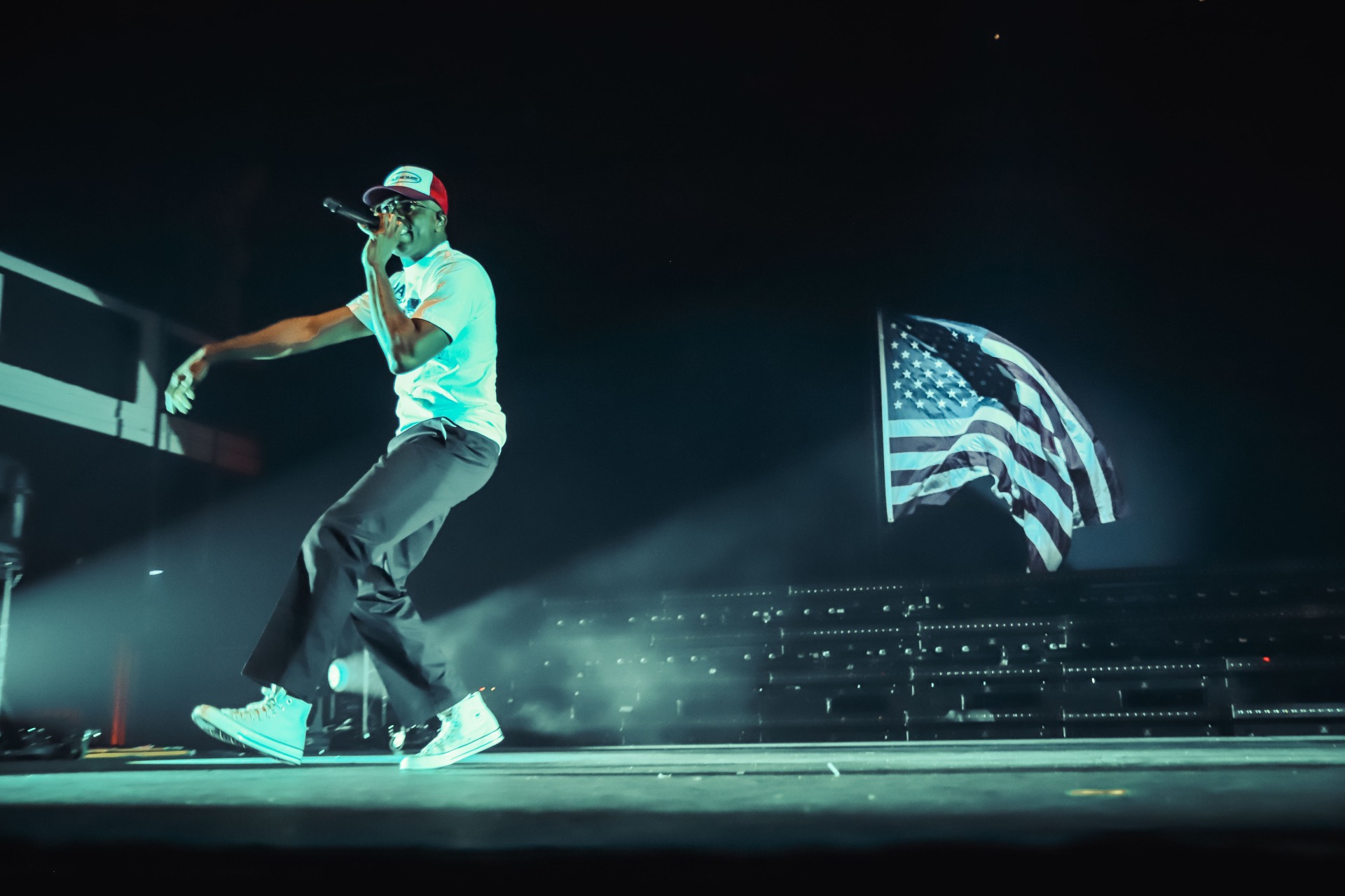 Following Baby Rose’s ethereal performance came Vince Staples with all the love and energy he has for both his own music and the hip-hop genre in general. I first discovered Vince when he appeared on Earl Sweatshirt’s 2013 album “Doris” where he was featured on the song “Burgundy” and since then I was hooked on his music. His talents and personality are one that will etch him onto hip-hop history as a legend and someone who presents themselves with true authenticity to help add to the art form. As Vince Staples enters the stage, the audience roars with excitement and without any hesitation, he starts his set with the song “Black & Blue”. The stage set design is simple with a few platforms and the US flag waving in the background. It is with this simplicity that we get to truly pay more attention to the rapper and his talents. With the minimalistic stage design, Vince is truly able to direct all eyes on him and allow his audience to be immersed in his genius lyricism and exceptional presence. Additionally, given the fact that it’s a hometown show, the crowd is absolutely raving and their screams of excitement are some of the loudest I’ve heard in a while.